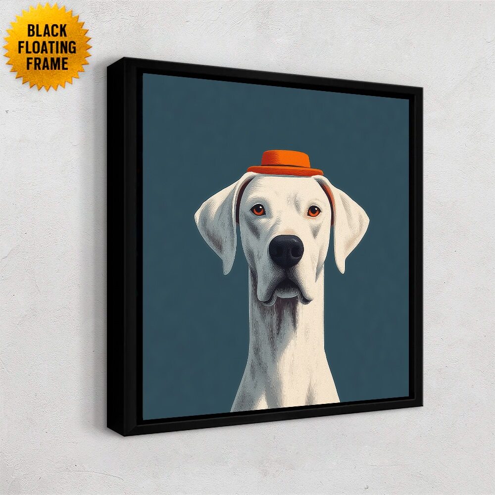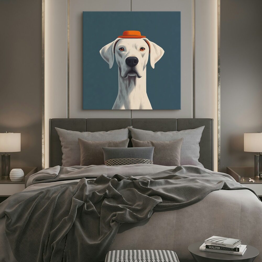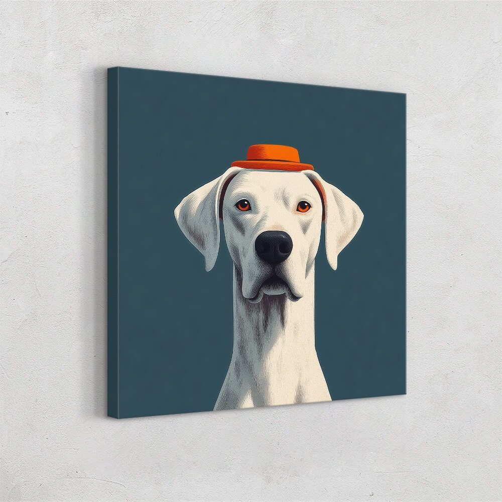A minimalist portrait of a white dog facing forward against a muted teal background. The dog wears a small orange hat perched neatly on its head, giving the image a whimsical, slightly humorous tone. The composition is clean and centered, with soft lighting that emphasizes the dog’s calm expression and smooth fur texture.