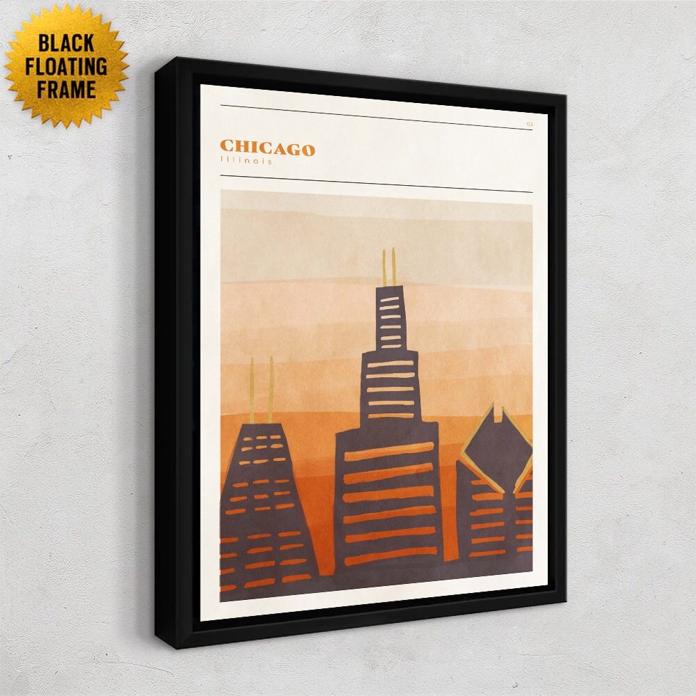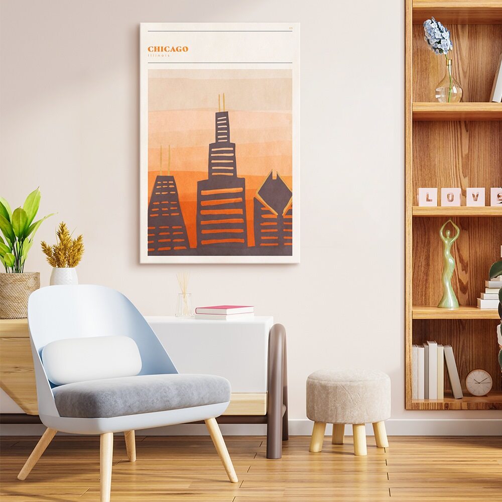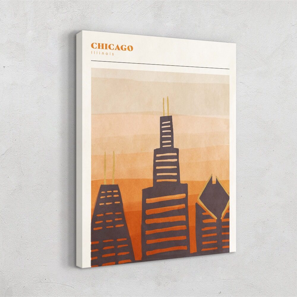 This Chicago artwork keeps things simple and stylish with a warm, retro-inspired color palette. The Willis Tower and other familiar skyscrapers are reimagined in bold, blocky shapes with soft, hand-painted textures. Layers of muted oranges, tans, and browns build a cozy, sunset-like backdrop, giving the whole piece a relaxed, mid-century travel-poster vibe. It’s a clean, modern way to show love for Chicago without going too literal or detailed.
