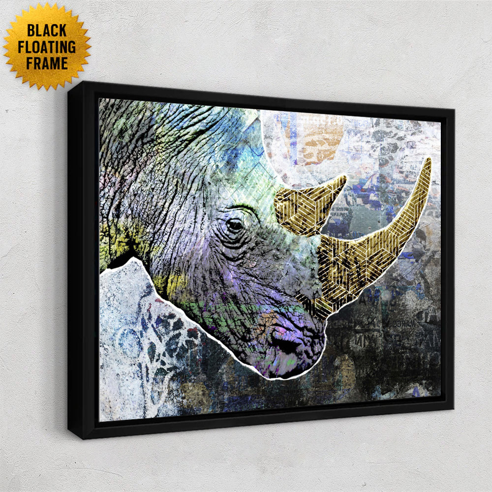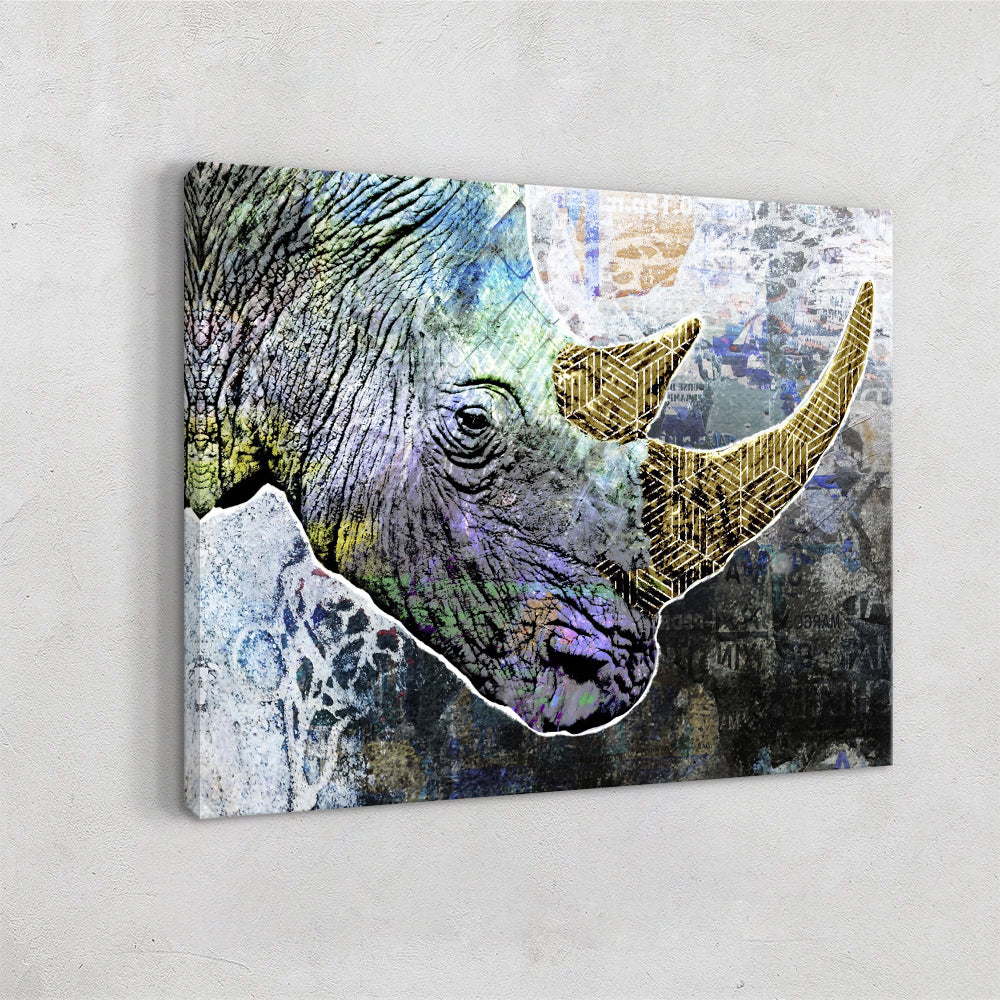 This striking mixed-media artwork features a powerful rhinoceros portrait infused with bold color and texture. The rhino’s skin is rendered in layered washes of blues, purples, greens, and earthy tones, giving it a surreal, expressive quality. Its horn stands out with an intricate gold geometric pattern, adding a modern, stylized twist to the animal’s iconic silhouette. Set against a distressed, collage-like background of abstract marks and muted tones, the piece blends wildlife art with urban contemporary style. Perfect for adding edge, energy, and sophistication to any space.