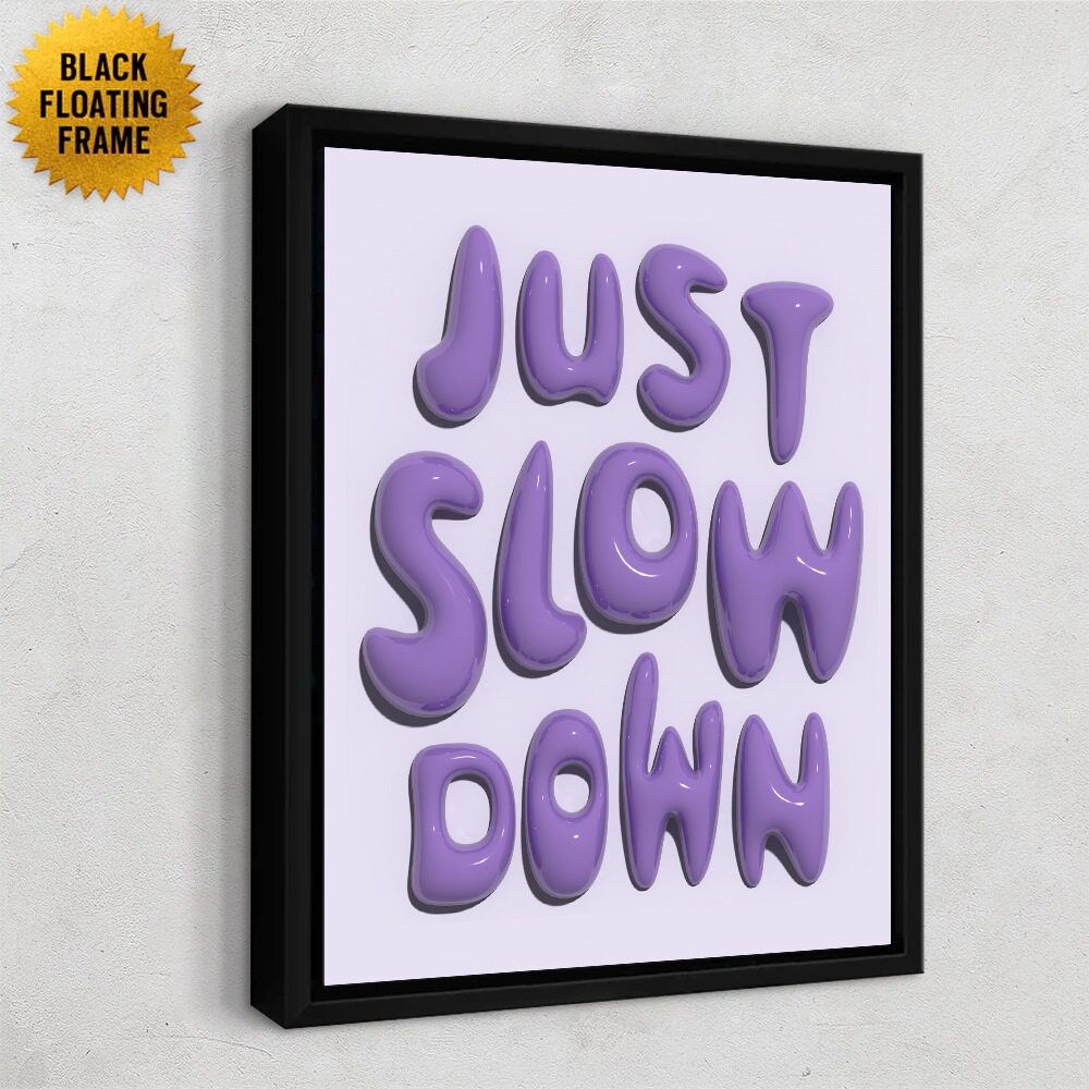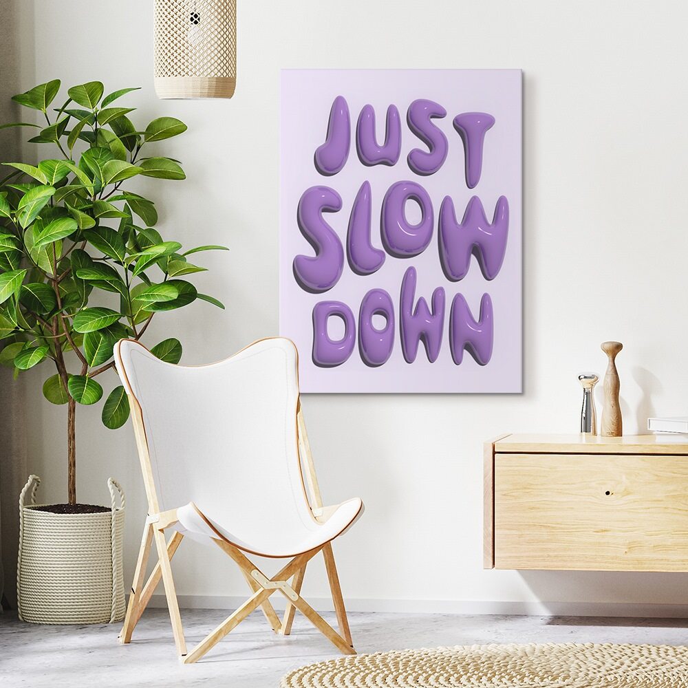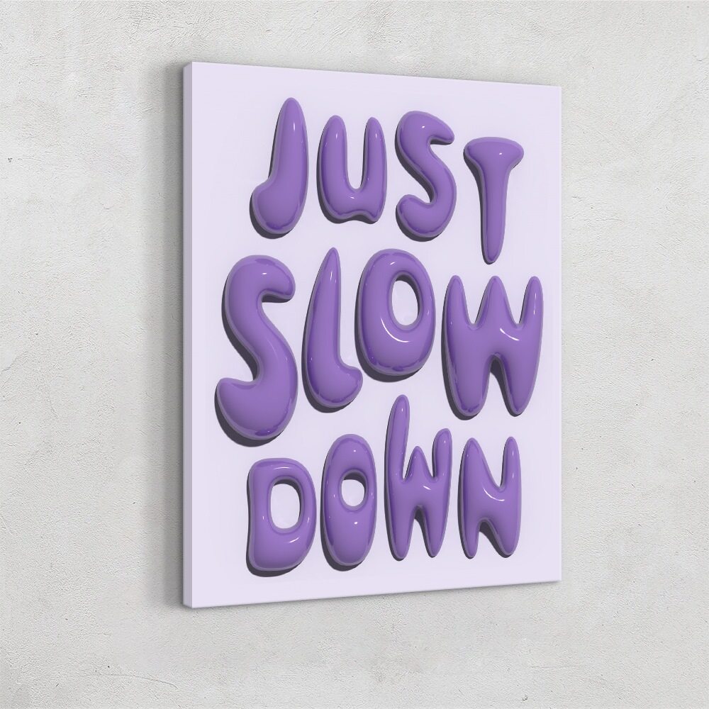 A playful typographic artwork featuring the phrase “JUST SLOW DOWN” rendered in shiny, three-dimensional, lavender bubble letters. The soft, rounded shapes give the text a gooey, almost candy-like appearance. The letters stand against a pale lavender background, creating a calming yet visually engaging composition that emphasizes the gentle message of slowing down.
