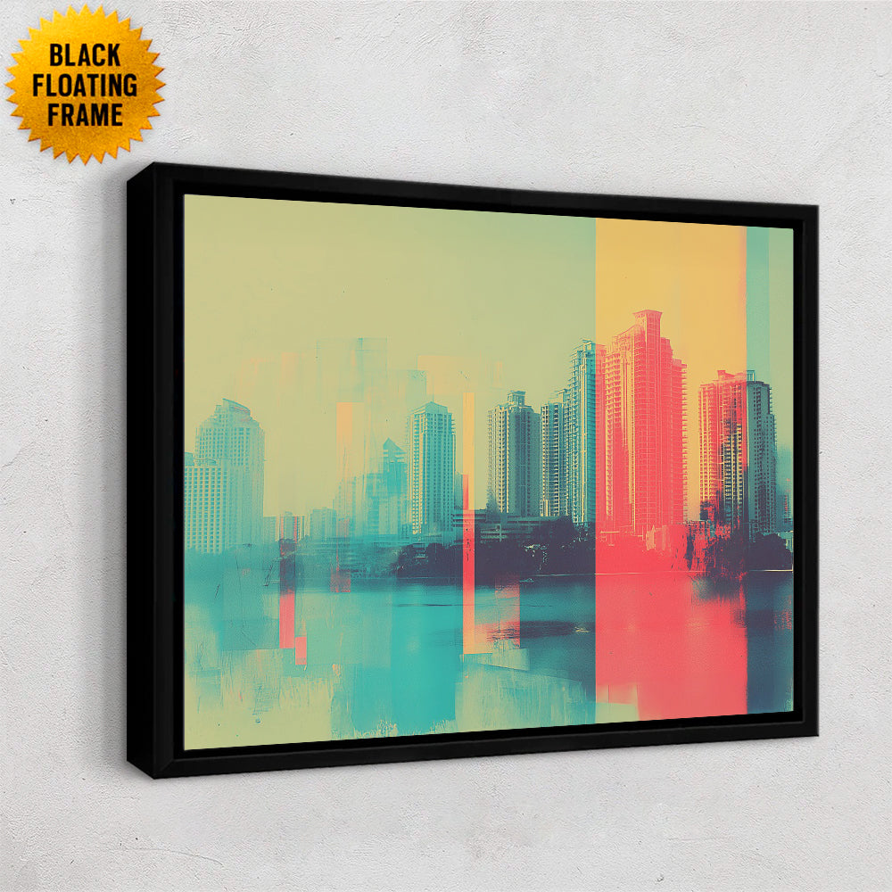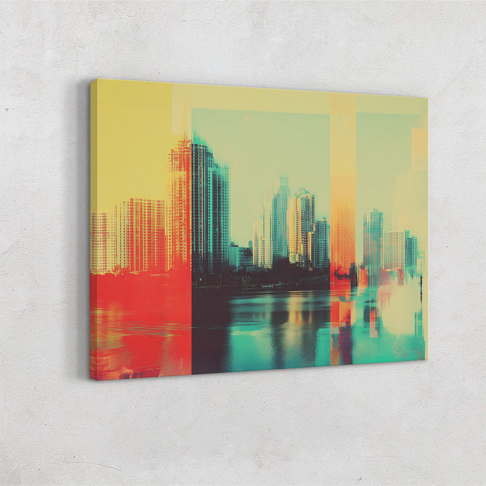 An abstract city skyline fractured by bands of color and digital distortion, where tall modern buildings blur and repeat across a reflective waterfront. Warm reds and yellows clash with cool blues and teals, creating a sense of motion, interference, and urban instability—as if the city is caught between clarity and signal loss.