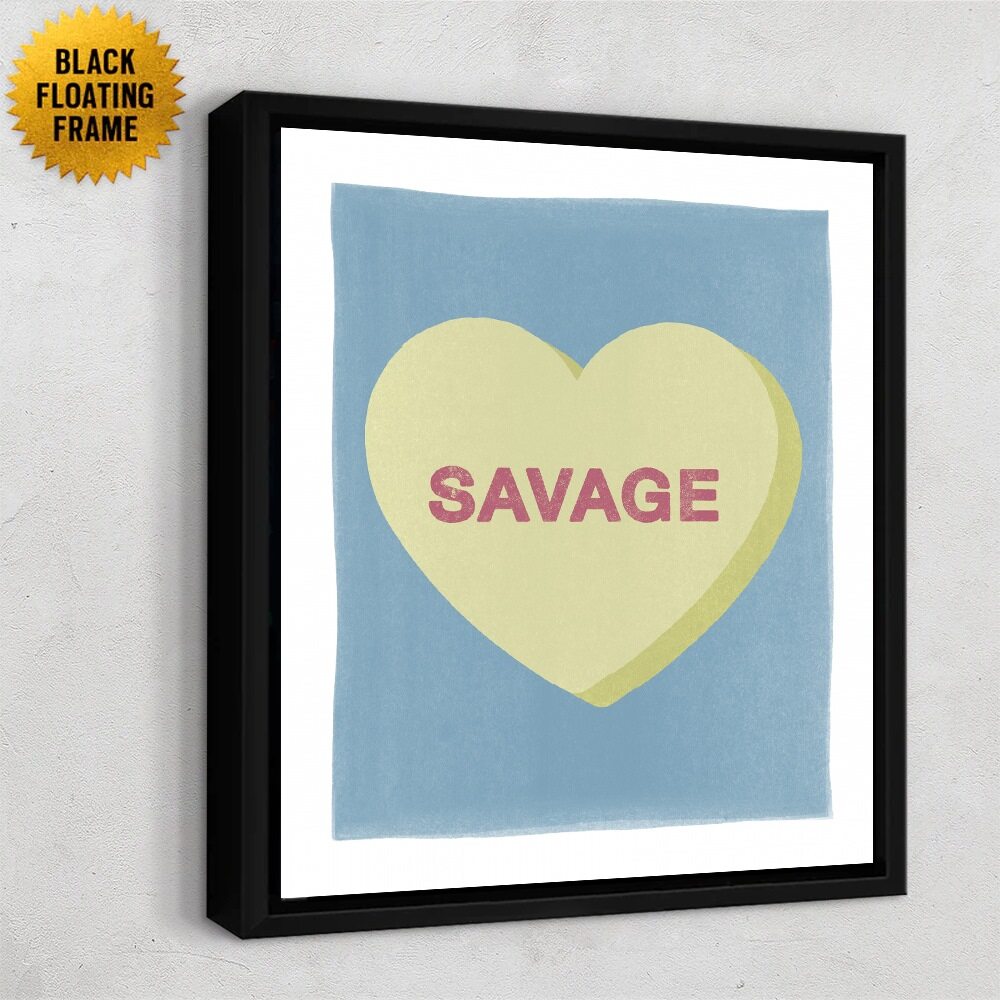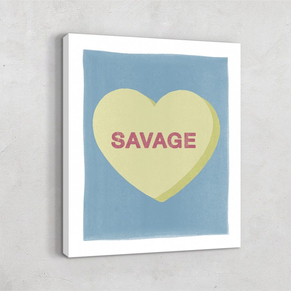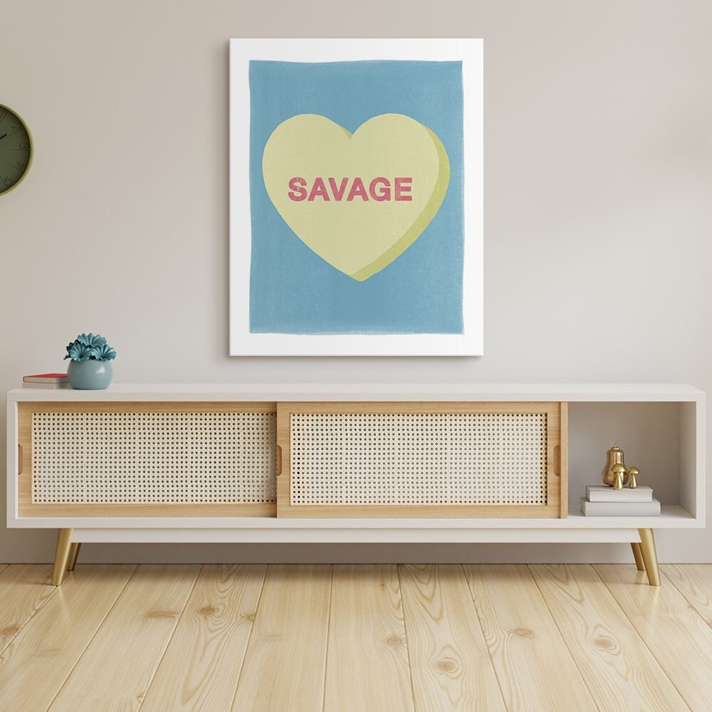This print gives classic candy-heart vibes with a bold, modern twist. A soft yellow heart sits against a cool blue background, carrying the word “Savage” in confident pink lettering. The pastel colors keep it sweet, while the message adds a punch of unapologetic attitude. It’s a fun, stylish way to bring personality and edge into any room.