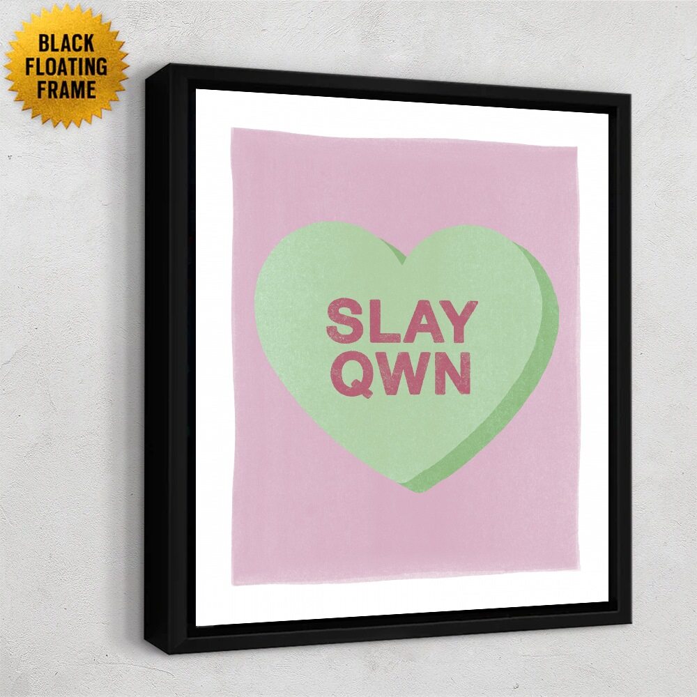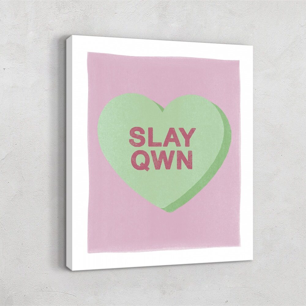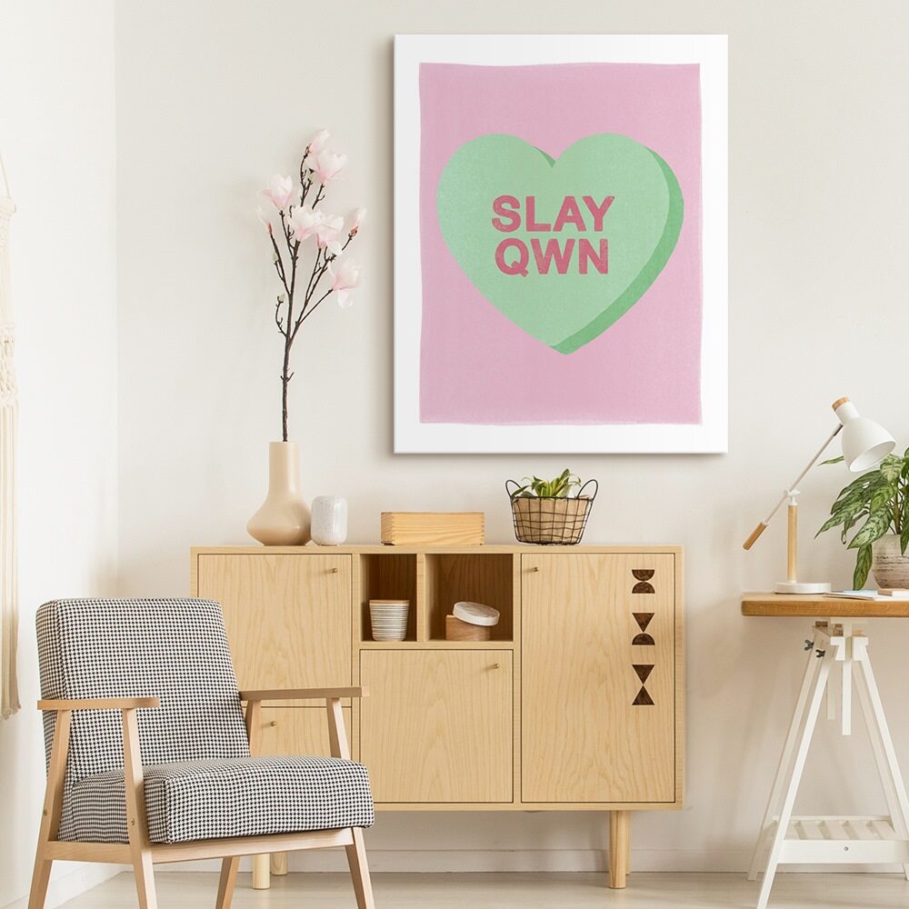 This print is playful, bold, and full of queen energy. A mint-green candy heart sits against a soft pink background, featuring the phrase “SLAY QWN” in bright pink lettering. The combo of sweet pastel tones with a confident message makes it a fun, empowering piece for bedrooms, offices, or anywhere you want a little daily hype.