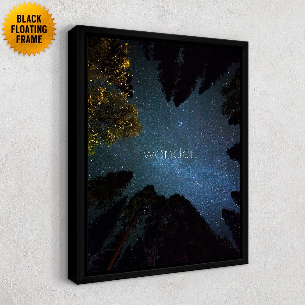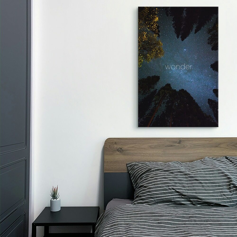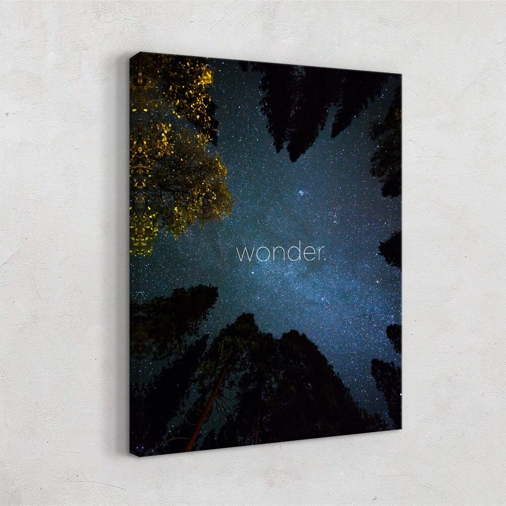 This artwork captures that quiet, awe-filled moment of looking up at a night sky framed by towering trees. The stars scatter across a deep blue backdrop, while soft hints of golden leaves glow along the edges. The word wonder. sits gently in the center, almost blending into the sky, which makes it feel calm, reflective, and a little magical. It’s a perfect piece for anyone who loves nature, stargazing, or art that brings a sense of stillness and curiosity.