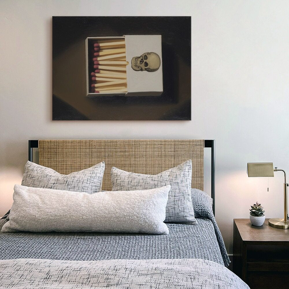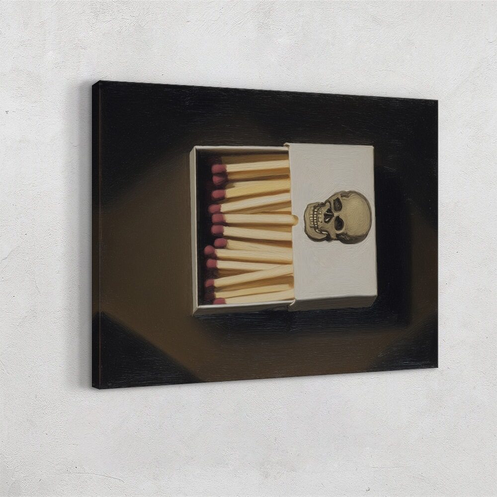 A moody, painterly still life depicts an open matchbox resting against a dark, shadowed background. Inside, neatly arranged wooden matches with red tips fill the tray. The sliding cover of the box features a detailed illustration of a human skull, creating a striking contrast between the ordinary object and the ominous symbol. The warm tones of the wood and match heads glow subtly against the deep black surroundings, reinforcing themes of danger, mortality, and potential destruction suggested by the title Fire Starter I. The composition feels minimal yet symbolic, evoking quiet tension.