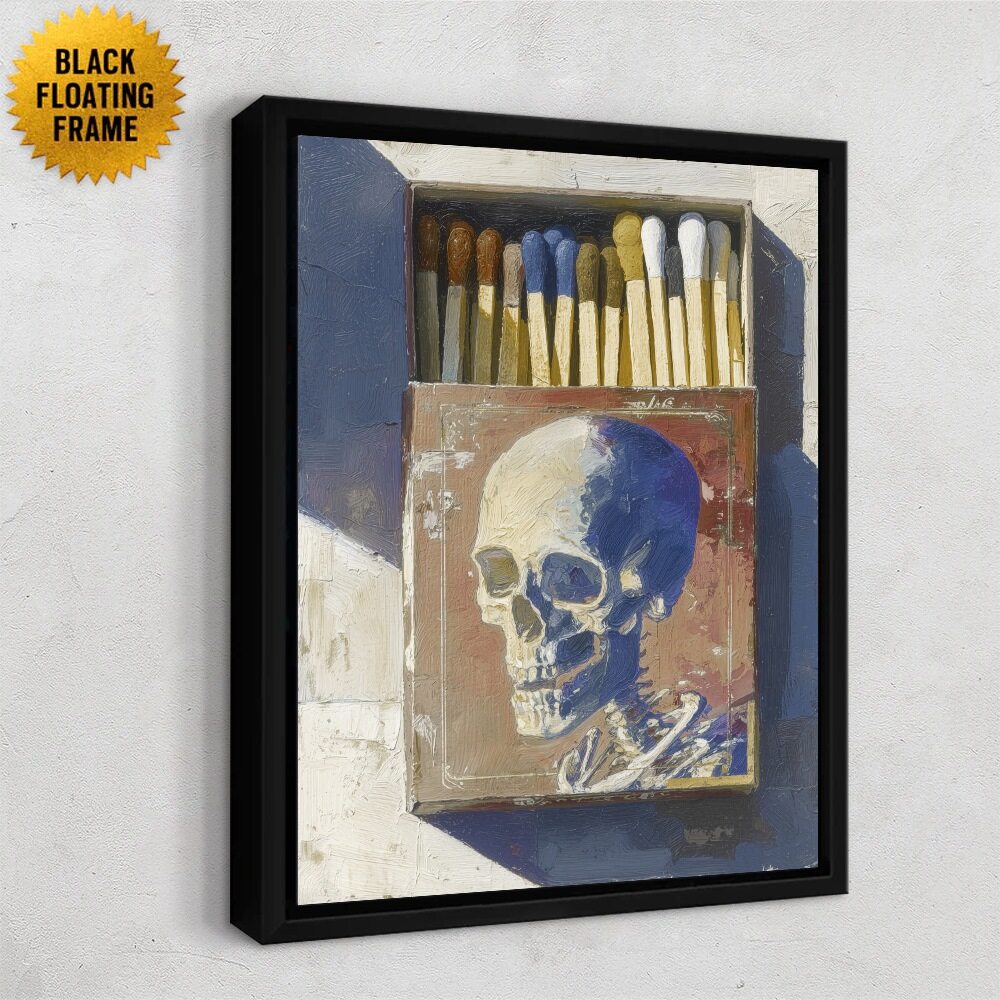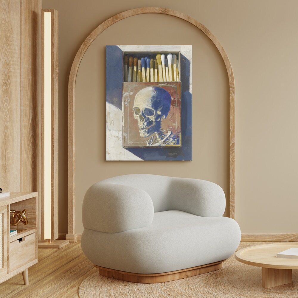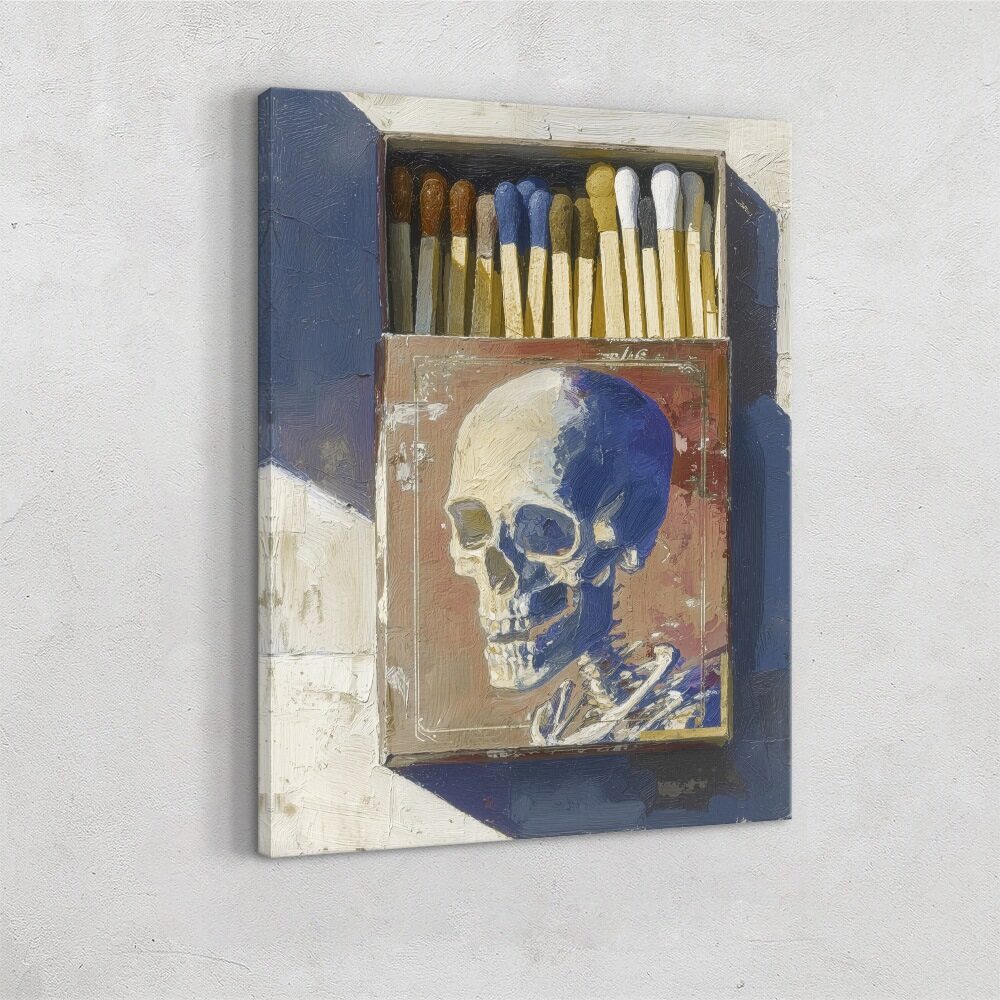 Inner Fire II depicts a stylized oil painting of a skull and partial skeleton contained within a vintage matchbox. The matchsticks are arranged neatly above the skull, their colored tips—blue, brown, yellow, white—suggesting potential ignition. The skull itself is painted with expressive, textured brushstrokes in muted creams and deep blues, creating dramatic shadow and depth. The composition evokes themes of mortality, fragility, and latent energy—life and flame contained within a small, combustible vessel. The thick, tactile paint application enhances the physicality of the subject, reinforcing the tension between stillness and ignition.
