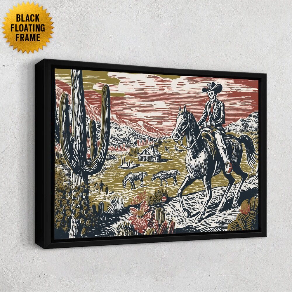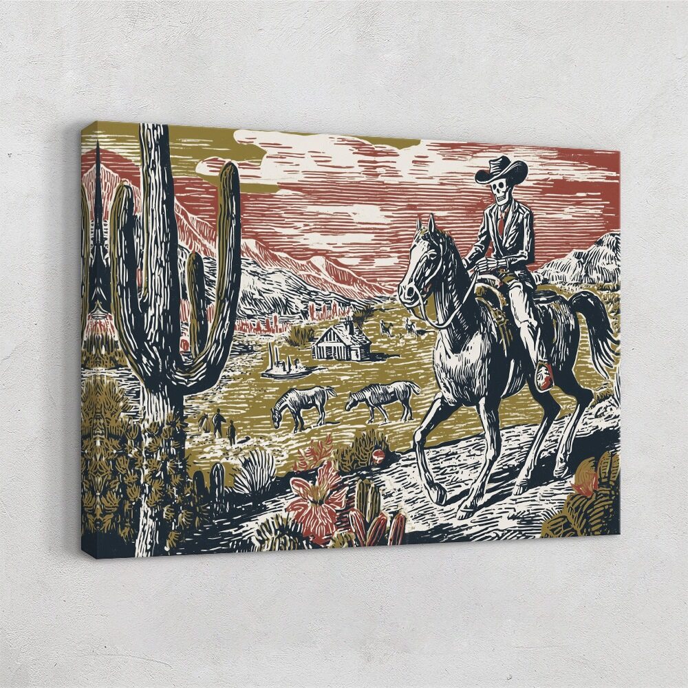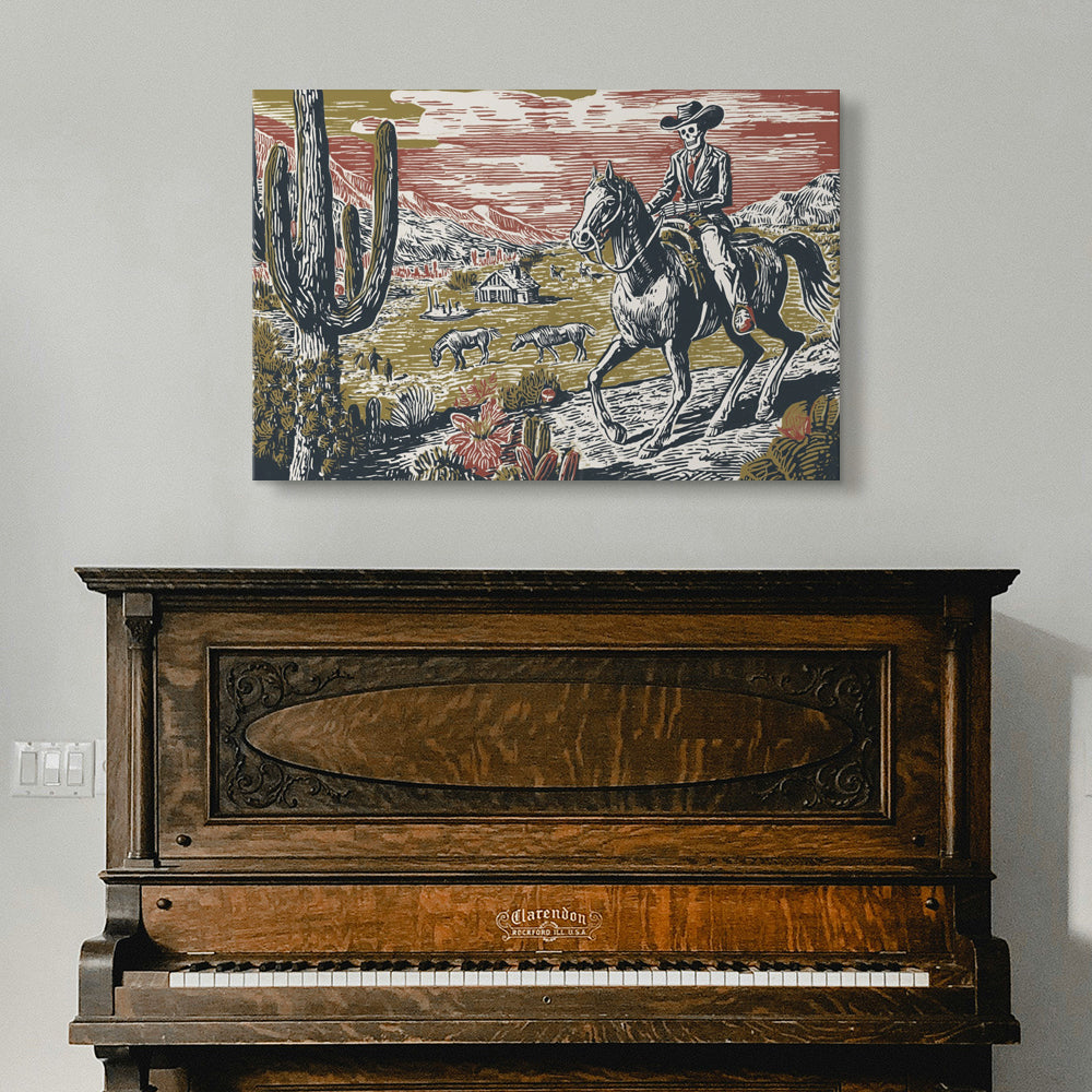 A striking woodcut-style illustration depicts a skeletal cowboy riding a dark horse across a vast desert landscape. Towering cacti frame the foreground, while distant mountains and a rustic homestead sit beneath a dramatic red-streaked sky. Grazing cattle and small figures dot the open plain, reinforcing the Western frontier setting. The skeletal rider, dressed in a suit and wide-brimmed hat, evokes themes of mortality, endurance, and inevitability. The limited palette of muted gold, deep navy, cream, and red enhances the vintage printmaking aesthetic, giving the piece a bold, timeless presence.