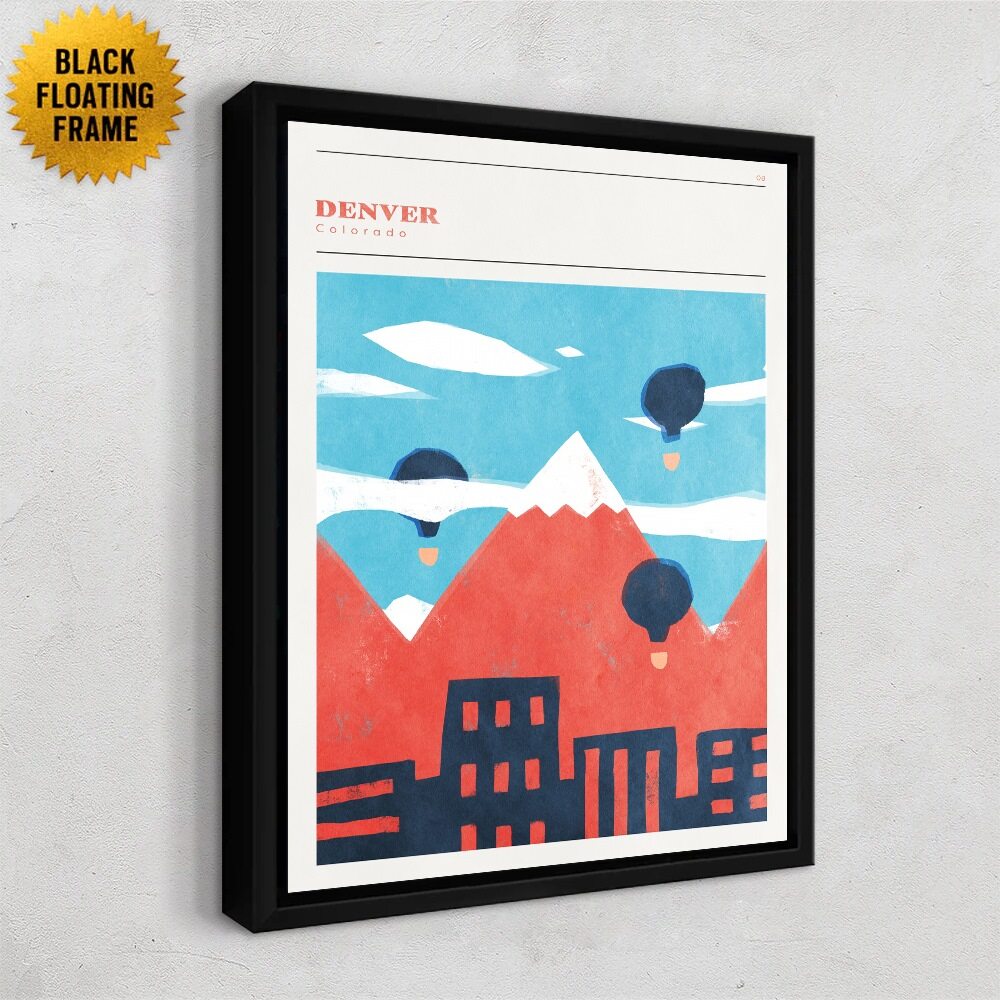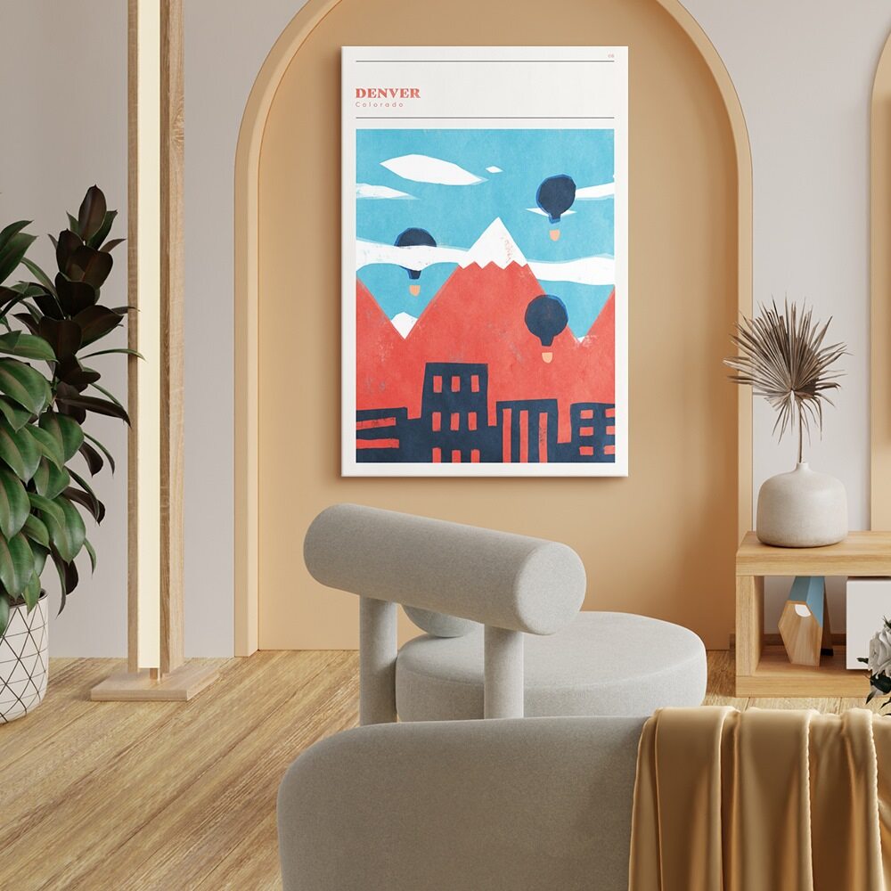 This Denver artwork has a fun, modern travel-poster feel with its bold, blocky shapes and warm color palette. Snowy mountains rise above a simple city silhouette, while hot air balloons float across a bright blue sky, adding a playful touch. The hand-painted textures and soft edges give the piece an easy, breezy vibe that fits Denver’s mix of adventure and city energy. It’s a clean, cheerful take on the Mile High City.